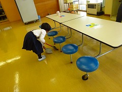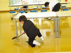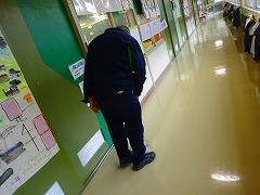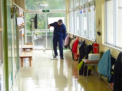 ↓ 校務員さんが、取れにくい廊下の汚れをこすって、きれいにしてくださっています。黒い点のような汚れを見つけて、拭いてくださっていました。学校はかなりの年月はたっていますが、心を込めて掃除をすることで、美しく磨き上がります。大切に使っていきましょう。ありがとうございます。