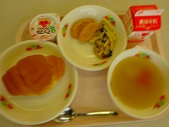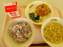 ↑ 今日の給食は、ゆかりごはん、甘えびのかき揚げ、もやしときゅうりの酢の物、あんかけうどんです。うどんがあんかけになっており、食べやすくそして、温まりました。