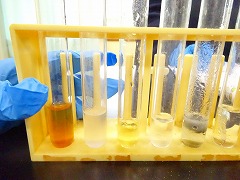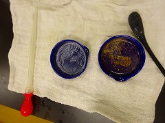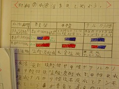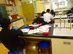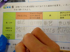 ↑ 6年理科 前時は金属を塩酸に溶かしました。今日は、塩酸に溶かした金属(アルミニウムや鉄)をもう一度個体に戻しました。さて、溶けて戻った個体は、もとの金属(アルミニウムや鉄)と同じ性質なのかどうか調べました。色やつや等を比較しました。