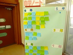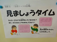 ↑ 給食後、全校で自学ノートの「見ましょうタイム」を実施しました。今日は2年、4年、6年の自学ノートを見て、学び方を学びました。どこが良いかを理由を付けてコメントを書きました。自学にもねらいと振り返りが書かれているものが多く、いいなあと思いました。ねらいには〈水溶液のまとめをしよう〉、〈公式を確認しておこう〉、〈間違えを直そう〉、〈式の意味を考えながら解こう〉等、今日は何を学ぶのかをはっきりさせて自学に取り組んでいました。振り返りには、その感想や大事だと思うところが書かれています。よい学び方を参考にして、自学のレベルアップをみんなで目指していきましょう。