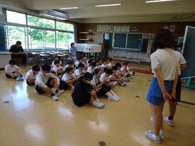 12日(水)に津幡警察署の方と不審者侵入訓練と防犯教室を行いました。1階12年教室に不審者が侵入したという想定です。子供たちは,落ち着いて行動し避難することができました。職員は不審者との対応訓練を実際に行いました。訓練後の津幡警察署の方による「防犯教室」では,不審者から声をかけられたら,はっきり「いやです。だめです。行きません。」と断るなど「いかのおすし」の具体的な話や不審者に遭遇した時に大声を出したり,逃げたりする練習をしました。自分で自分を守ることが大切だと教えていただきました。