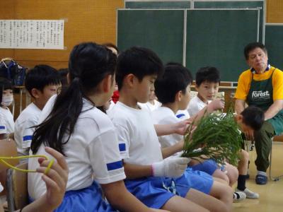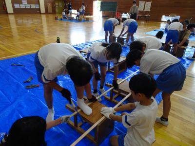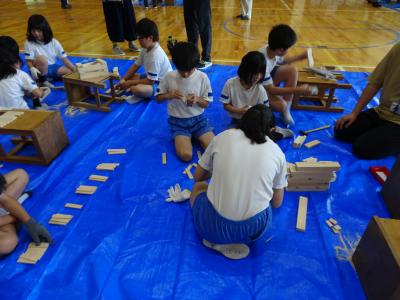 こども森の恵み推進事業として,県央森林組合の方,林業研究会の方をお招きして学習をしました。まず,「杉・あて・ひのき」などの枝を実際に見せていただきながら木についてのお話や「里山」についてのお話を聞きました。その後,たてわりグループでひのきでひとり一台「木琴」づくりに挑戦しました。1・2年生は「ばち」をつくったり,3年生は切った木片にやすりをかけたりくぎを打ったり,4年生~6年生はのこぎりで木を切ったりしました。グループでとてもよく協力して作成できました。最後に自分で鍵盤を貼って完成です。さて,どんなの音色の木琴になったかな。