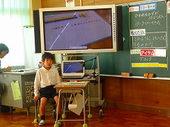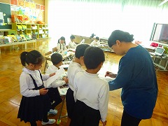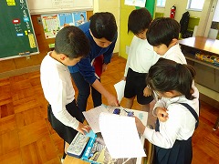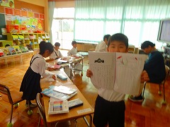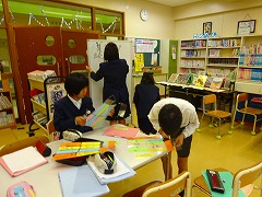↓ 2年生 生活科 秋の町探検のまとめをしていました。写真を見て、どんな題名にしようか話し合いました。
