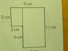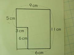 ↓ 4年 面積の求め方の学習です。補助線を入れて、求め方を工夫しました。