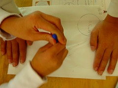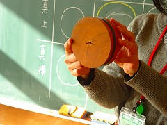↓3年 算数 球について調べました。球の中心を通った場合の切り口とそうではない場合を想像し、実際に模型で確かめました。