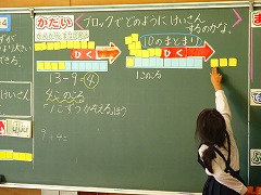 ↓ 1年 算数 13-9の計算の仕方をブロックを動かしながら学習しました。しっかり理解ができ、思わず拍手がわき起こりました。友達の理解を喜び合う美しい心がが学習意欲をさらに向上させてくれます。