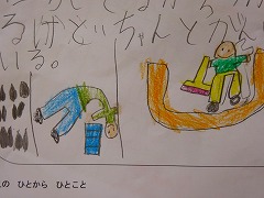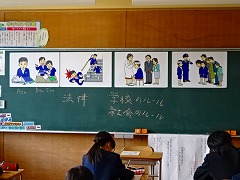 2年生では、友達だからといって、物を取ったり隠したりすると、窃盗罪や器物破損罪となること、友達だからといって叩いたり蹴ったりすると暴行罪となり、どれも10年以下の懲役となること、社会にはルールがあり、子供だから許されるものではない、少年院というところもあることなどを教えていただきました。子供は、まずは、学校のルールを守ることが必要であり、それは、一人一人どの子も幸せになる権利があるので、それを脅かすことは決して許されないためであり、実例のイラストを通して考え、学習していきました。