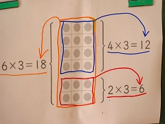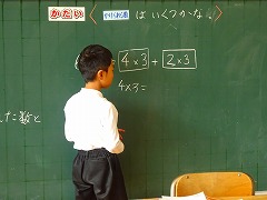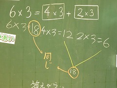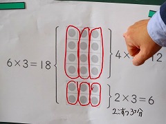 ↓2年 算数 6×3=4×3+2×3 となるわけを、式や図を示しながら、説明することができました。式で答えが同じになることを確かめ、図と結び付けて考えを深めました。図の見方を変えることにより、納得できる説明にたどり着きました。全員参加で自ら考え深めていく学習を積み重ねています。