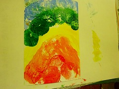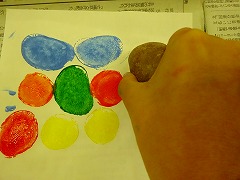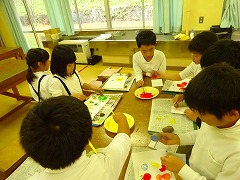 ↓ 3,4限図工 1,2年 イモ版画で年賀状をデザインしました。虹や花、動物などイモの切り口に絵の具を付けて、それぞれに工夫しました。