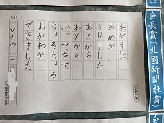 初めに表彰伝達を行いました。まず、県の硬筆コンクールの作品の表彰です。鉛筆の持ち方、姿勢を正して、一文字一文字を丁寧に書いていると、だんだん上達します。いつも美しい字で書くことを心がけてほしいと思います。1年生のKさんは、県会長賞に選ばれ、県庁の19階ロビーに展示されていました。次は、河北郡市図画作品展、津幡町子ども会作品展の順で表彰を行いました。