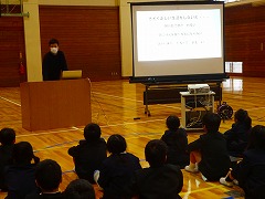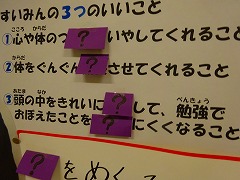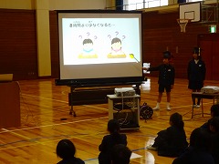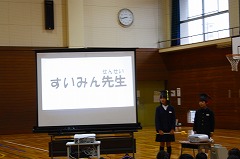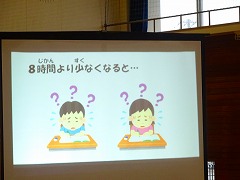 ↑ 元気委員会さんが、劇をして睡眠をしっかりとることを呼びかけてくれました。睡眠をたっぷりとらないと、昼に学習したことを脳で並び替えて整理する時間が取れません。それで、昼にしっかり学習をしても、頭の中に残らなくなるのです。1年生から3年生は10時間、4年生から6年生は9時間の睡眠が必要です。睡眠が足りない人は、賢くなるためにも、今日から睡眠時間を計算して、早く寝てください。