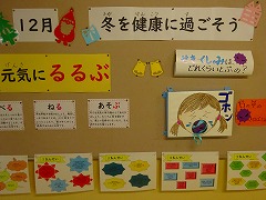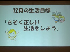 ↑ 12月の生活目標は規則正しい生活をしようです。特に3つのことを、みんなで取り組みできたかどうか、表にシールを貼って振り返ります。①夕食までに宿題を終わらせること、②( )時までに寝る、③( )時までに起きることです。毎日を元気に過ごすために、生活を見直し、実行しましょう。ご家庭でも、ご協力お願いします。