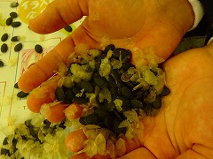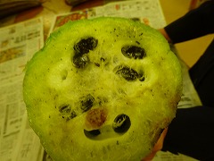 ↑ 4年 理科 秋に実ったヘチマの中の様子を観察しました。茶色く枯れたヘチマは筋がたくさんありました。1粒の種から大きく育ったヘチマ、中には、たくさんの種が実っていました。