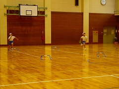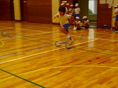 ↑ 3,4年小型ハードル走 速く跳ぶにはどうしたらよいかチームで相談しています。