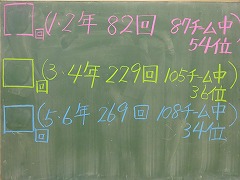 ↑ 今回は、高学年は271回跳びました。低学年102回、中学年136回です。休み時間などにまた練習を重ねてください。寒い時期のよい運動となり、チームワークが高まります。す。