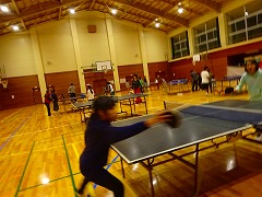 ↑ 夜7:00~8:30まで、卓球練習に励んでいます。素振りは、本当に球があるつもりで、フォームを整えるために行います。