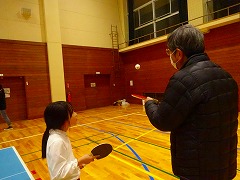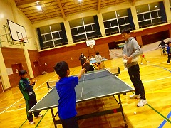 ↑ 地域の先生や卓球クラブの方がご指導くださいます。お父さんやお母さん方も見守り、練習の相手をしてくださっています。