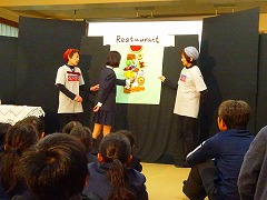 ↑ 今日は「お話の家」の皆様をお招きし、人権意識を高揚するために人形劇をしていただきました。まずは、「しりとりレストラン」や手遊び歌で、ウォーミングアップです。フエルトでの手作りで温かなメニューが並んでいました。