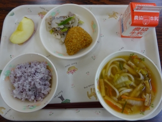 ゆかりごはんに、うどんにリンゴ…やさしいあったか給食です(7日)