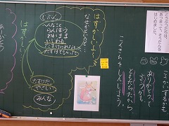↓3.4年道徳 本当の親切とはどんな心なのか考えました。自分が一番大切にしていた本を大雨が降った村のウサギさんにあげたその心について話し合い,親切の心について考えを深めました。
