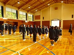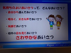 ↑ 生活のお話は、挨拶についてです。目を見て、明るく、元気に、心を伝える挨拶をしてくださいと伝えました。さっそく気合(「気愛」)のある挨拶をたくさん聞くことができました。