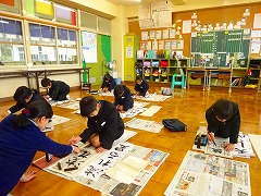 ↓ 5年生は、「進む勇気」、6年生は「新たな決意」勢い、筆遣い、バランス、気合を込めて書き上げました。