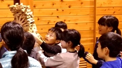 次に向かったのは,森林公園のインフォメーションセンター。係の方に,木の種類によるそれぞれの特徴について教えて頂いた(左写真)後,自由学習となりました。児童たちは,いろいろな木材サンプルを興味津々で触って感じて(写真中央)いました。昼食後は,木材を積み上げることに集中する児童が増え,中には背丈を上回る高さまで積み上げるグループ(右写真)もでました。3校の児童たちが,学校ごとに固まらず,仲よく混ざって遊んでいたのでうれしかったです。最後に,木育関係のプレゼンテーションがありました。