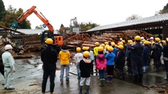 最後の目的地は,金沢森林組合ウッドプラザ(金沢市宮野町)。ここでは,間伐材の製材や,加工工場の見学などを行いました。(雨は止んでいました。)太くて長い木材(杉)が,機械で次々に角材になっていく様子(中央写真)には,児童たち,目を丸くしていました。その他,いろいろな作業を見学しました。丸太切り(右写真)や,ロール釘打機による釘打ち作業も体験しました。釘装てんはマガジンによって行われ,さながらマシンガンのようでした。