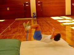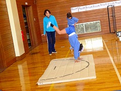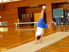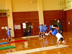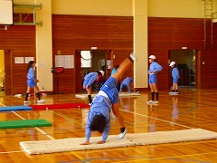 ↑5.6年マット運動 連続技に挑戦 自分の技の美しさを極めています。