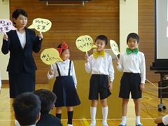↑ これは今月の生活目標「気持ちのよい言葉遣いをしよう」について,全校に説明しているところです。優しい思いやりのある「ふわふわ言葉」や心がきりっとする丁寧語「シャキーン言葉」をつかっていきたいと思います。自分がつかった気持ちのよい言葉をりんごカードに書いて,学年んの枝に増やしていきます。ていねいな言葉,優しい言葉が普通につかえる笠野っ子であってほしいと願っています。