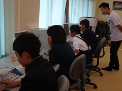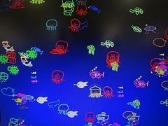 ↓ 低学年 低学年の子供たちがPCで描いた魚たちを,みごと,海の中で動かすことに成功!左右上下に面白いように動き,歓声をあげていました。プログラミングって,面白い!