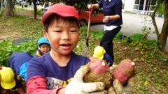 1・2年生が笠谷保育園に行き,3~5歳児と芋掘り体験交流をしました。保育園のさつまいもはとても大きく立派でした。その後,(先に作ってあった)石焼き芋をいただきました。本当の石焼きでした。最後に,いっしょにゲーム(おたまでのボール運び)をしました。