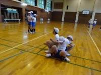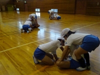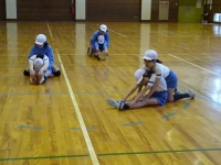↓ 5,6年生 体育 体ほぐし運動で柔軟性を高める運動です.3人でタイミングを合わせて立ち上がる運動です.H29新体力テストでは柔軟性が低かったので体育では継続して取り入れています.いろいろなバリエーションがあり楽しそうに運動していました.
