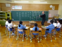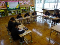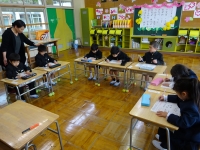 ↓1年生 算数プリントを頑張りました.よい姿勢で集中して名前を書いています.