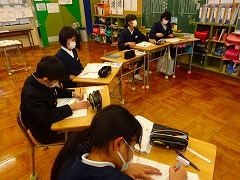 ↑ 5,6年複式算数 5年は円の性質を用いて正多角形を作図できるか考えました。今日は正八角形の描き方を考えました。「辺の長さがみな同じだから」、「中心の角度を八等分して」等の考えが出されました。理由をつけて説明する力が、ずいぶん育ってきました。「ここまでは分かるけれど、ここから分からなくなりました」と、自分の状況をしっかり伝える聞き手にも感心しました。