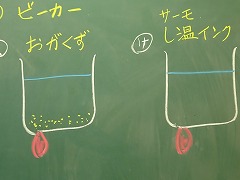 ↑4年理科 水の温まり方を図を描いて予想を立てています。し温インクやおがくずを用いて、予想通りか実験しました。