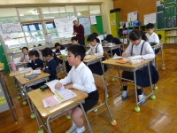 ↓5.6年社会 授業開きのオリエンテーションです.5円玉に5年生で習う学習がすべて入っていると教えていただき,改めて興味深く5円玉を観察しました.6年生は年表を見て歴史の世界に思いを馳せました.