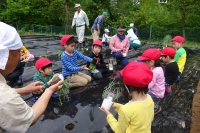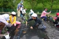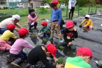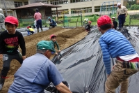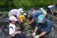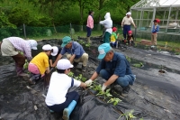 ↓5月18日(金)地域の畑の先生に教えていただきながら,1,2年生は苗植えをしました.マルチを張るのは,いろいろな意味があり,水分保持,保温,除草,水の跳ね返りによる病気予防などに効果があるからだそうです.サツマイモ,枝豆,胡瓜,なす,その他,ハーブの苗を植えました.畑の先生には植え方を教えていただいただけでなく,耕し,畝をつくり,風で倒れないように棒をたて,つるが巻き付けるようにわらで「手」をしていただき,おかげで立派な学校農園になりました.子供たちが,地域の方とふれ合い楽しく野菜を植えた体験は,子供たちの心に残る温かい思い出となったことでしょう.蒸し暑い日でしたが本当にありがとうございました.