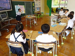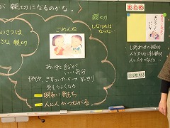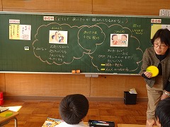 ↑「ごめんなさい」ということは小さな親切かどうかはいろいろな考えがありました。本当に考えたいことは答えは1つではないのです。大切なことは、その理由と根拠です。「ごめんなさい」は正直に謝る心だから、親切と違うかもしれない」。でも、「ごめんなさい」を言うと、「人と人がつながるように思えるから、親切と同じだよ」、という考えや、「ごめんなさい」をいうと幸せな気持ちになれるから親切と似ているのでは?」「校長先生の考えも聞かせてください。」と、授業に誘われ、互いの考えを聞いてまた考え、主体的にどんどん深まる子供たちでした。