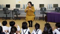 1学期に引き続き,金のがちょうさんが来てくださいました。いつものように手遊びから始まり,季節にぴったりの本を読んでもらったり,すてきな詩を紹介してもらったりしました。絵本「ふしぎなやどや」は,中国のお話でした。人をロバにしてしまうという,ちょっぴり怖いお話で,みんなはドキドキして聞いていました。すっかりお話の世界に入り込んでいました。金のがちょうの山田さん,木村さん,末友さん,今回もすてきな時間をありがとうございました。(登美)