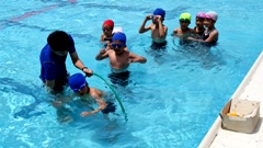 プール開き以降,なかなかプールに入れる条件が整わず,入れない日が続きましたが,この日は気温も水温も規定を上回り,初めてのプール授業となりました。最初に入ったのは1・2年生。楽しそうに学習していました。(落ち葉などのゴミをタモですくっていたら,ミズカマキリが泳いでいたので,捕まえて,後で,中庭の池に放しておきました。よく考えれば,ミズカマキリがプール1番乗りだった?)