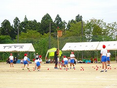 ↓ 紅白玉入れ かごを目指して、空高く紅白の玉が飛び交いました。