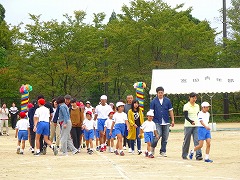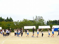 ↓ 6年生VS教員チーム対抗リレー 6年生は円陣を組んで、チームの士気を挙げています。我々教員チームも負けないわよ!