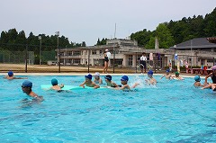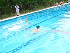↓模範水泳です。自分の得意な泳ぎ方で、2年生から6年生の児童が泳ぎを披露してくれました。すいすいと泳ぐ姿に、大きな拍手で称えました。