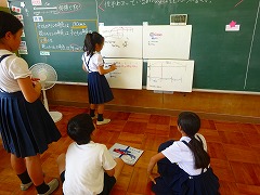 ↑ 4人の考えを見比べて、気づいたことを発表し、自分たちで修正していくことにチャレンジしていました。