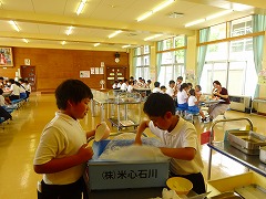 ↑ 完食です。おかずも、ごはんも、牛乳も、お替りしてモリモリ食べて元気いっぱいの笠野小学校です。いつも給食で食べているご飯は、笠野地区でとれたおいしいお米で、他のお米と混ざらないように、特別のラインで炊いてくださっているということです。今日はプールに入ったからでしょうか、食欲の出るメニューなのでしょうか、いつも以上にたくさんの人がお替りをしていました。
