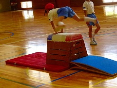 ↑ 3年生 体育 跳び箱にチャレンジです。技が終わった後、ぴたっと止まってのポーズも練習しています。