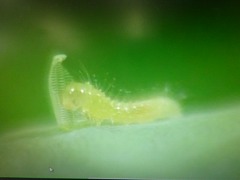 ↑ 3年理科 モンシロチョウの卵からかえって、幼虫が生まれ出たところです。ICT機器を用いて動きを詳しく観察しました。
