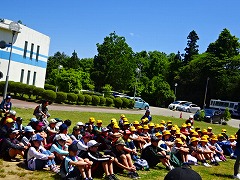 ↑ 能登少年自然の家に到着です。建物全体が、船の形をしています。入所式やオリエンテーションで、各自の役割を果たしています。