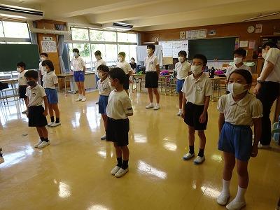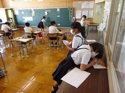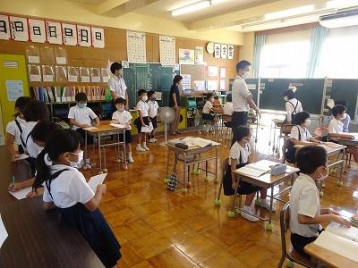 1限目、1,2年生が3,4年生の算数の授業を見学しました。複式の授業で、担任の先生は2学年分の授業を進めなければならないので、ガイド役の児童が先生に代わって授業を進める場面があります。3年生は今年度からこの形式で算数の授業を行っていますが、とても上手に行っていました。1,2年生は、ピリッとした授業の雰囲気を肌で感じ取ったようで、熱心に気づいたことをメモしていました。